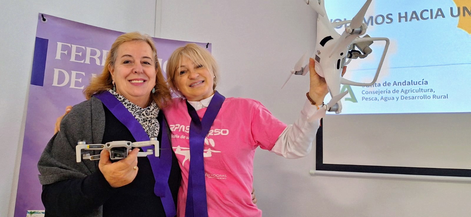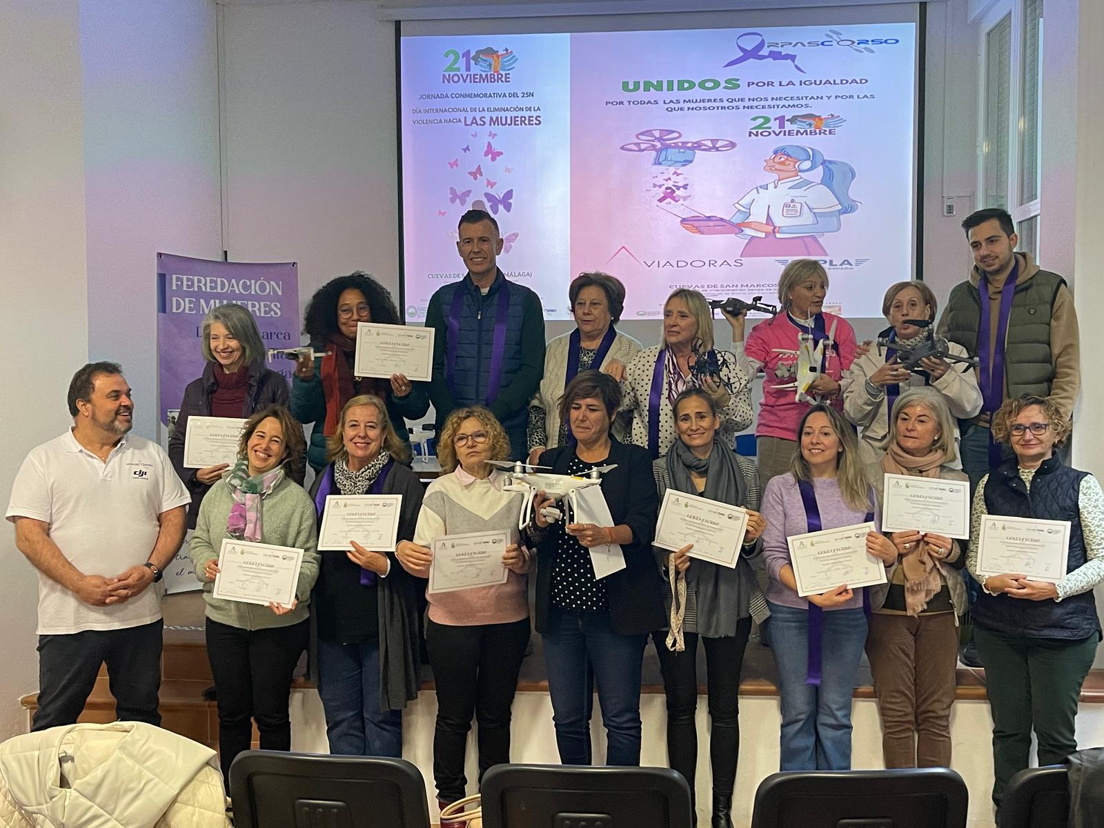 La Coordinadora de Organizaciones Andaluzas de Mujeres Rurales, COAMUR, clausuró en el centro de Interpretación de la Senda de Los Milenios de Cuevas de San Marcos, el primer curso de pilotaje de drones para mujeres rurales que organiza la entidad y uno de los primeros que se dirigen a las mujeres que viven en entornos rurales de Andalucía. En el marco de la conmemoración del Día Internacional para la Eliminación de la Violencia Hacia Las Mujeres, COAMUR organizó un acto dirigido a las alumnas después de que todas superaran el examen que las habilita como pilotas de drones. En la actualidad, el mundo en constante evolución, exige oportunidades de aprendizaje a lo largo de toda la vida para la realización individual, la cohesión social y la prosperidad económica. Así lo entiende COAMUR y así lo ha demostrado una de las alumnas María Teresa Cárdenas Blázquez que a sus 67 años ha conseguido su titulación como pilota de drones, convirtiéndose en la alumna con mayor edad en España en obtener la certificación de La Agencia Estatal de Seguridad Aérea (AESA). Ella supone un ejemplo real para otras mujeres, ya que ha conseguido superar todos los estereotipos y pensamientos limitantes asociados a las mujeres y en especial, a las rurales al alcanzar una determinada edad.