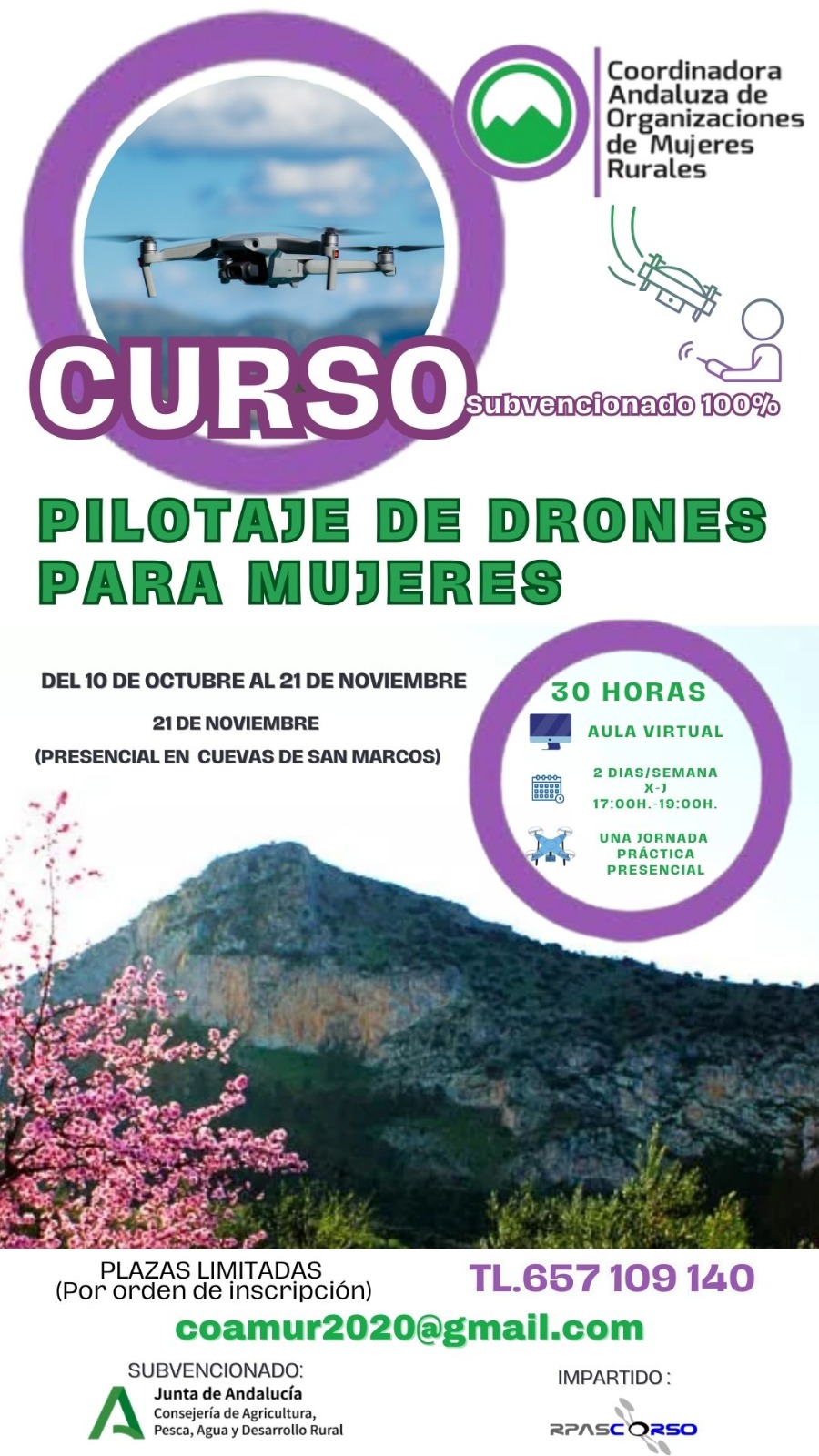 El curso de formación combina las clases teóricas con las prácticas presenciales que tendrán lugar en el municipio malagueño de Cuevas de San Marcos, el próximo 21 de noviembre. Las alumnas que completen las horas lectivas y superen el examen obtendrán la certificación de pilota de drones. La formación será impartida por la escuela de formación de alto rendimiento Rpascorso que cuenta con más de 15 de experiencia en el sector y comparte los valores de promoción de la igualdad real entre hombres y mujeres de COAMUR. Esta acción formativa forma parte de un proyecto más amplio financiado por la Consejería de Agricultura, Pesca, Agua y Desarrollo Rural de la Junta de Andalucía
